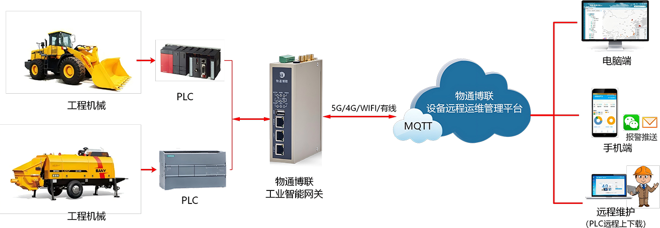 通過物通博聯(lián)的工業(yè)智能網(wǎng)關(guān),連接工程機械設(shè)備的控制器、傳感器等設(shè)備,實時采集設(shè)備的位置信息、運行狀態(tài)(如工作、空閑、故障等)、運行參數(shù)(如發(fā)動機轉(zhuǎn)速、油壓、水溫等)、油耗等數(shù)據(jù)。將采集到的數(shù)據(jù)傳輸至設(shè)備運維管理平臺,平臺對數(shù)據(jù)進行分析和處理。當設(shè)備出現(xiàn)故障時,及時發(fā)出預警,并通過物通博聯(lián)設(shè)備維護快線進行遠程維護,提高維護效率,降低運維成本,實現(xiàn)設(shè)備全生命周期數(shù)字化管理。
