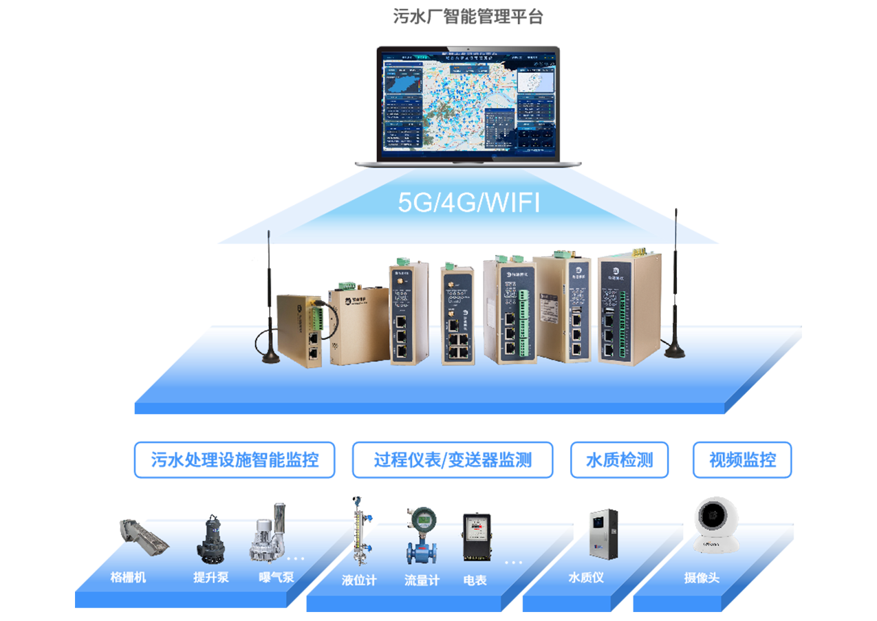 借助物通博聯(lián)的工業(yè)智能網(wǎng)關(guān),實時采集污水處理廠內(nèi)各類設備(如水泵、風機、格柵機等)的運行數(shù)據(jù),包括運行狀態(tài)、電流、電壓、溫度等,以及污水的流量、水質(zhì)指標(如化學需氧量、氨氮、懸浮物等)。將采集到的數(shù)據(jù)傳輸至污水處理遠程監(jiān)控平臺,進行數(shù)據(jù)存儲、分析和展示。平臺可對設備運行狀態(tài)進行實時監(jiān)測,當設備出現(xiàn)異常或水質(zhì)指標接近超標時及時發(fā)出預警,并提供故障診斷和處理建議。同時支持遠程運維操作,如設備參數(shù)調(diào)整、啟??刂频?,實現(xiàn)對污水處理廠的高效管理。