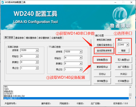 打開配置工具,選擇相應(yīng)的串口,點(diǎn)擊“自動(dòng)獲取波特率”,獲取成功后點(diǎn)擊“讀取配置”。