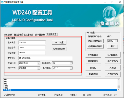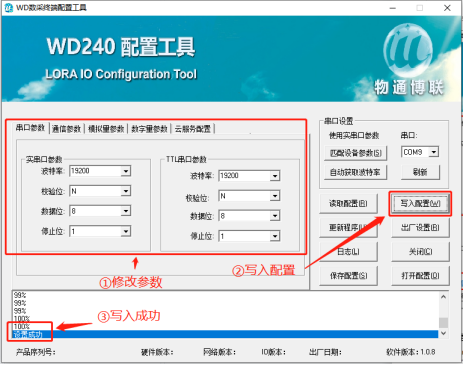 可以通過配置工具修改WD140設(shè)備的串口參數(shù)以及通訊參數(shù)(相關(guān)配置的說明請繼續(xù)閱讀此文檔),修改完成后點(diǎn)擊“寫入配置”,等待下方提示寫入成功后即可。