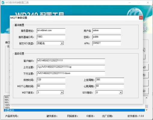 設(shè)置好基本參數(shù)后,點(diǎn)擊“MQTT配置”,配置MQTT服務(wù)器的IP地址,端口以及上下行主題(Topic)等參數(shù),如下圖: