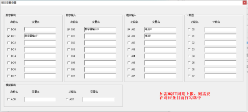 注:如果需要配置串口數(shù)據(jù)透傳到MQTT服務(wù)器,只需要在上下行主題加入“trans”字樣即可,主題中含有“trans”即代表網(wǎng)關(guān)為透傳模式。配置好MQTT參數(shù)后,關(guān)閉子窗口,點(diǎn)擊“報(bào)文變量設(shè)置”,可自定義變量名稱,可按需設(shè)置需要上報(bào)的點(diǎn)位,在需要上報(bào)的點(diǎn)位名稱前面打鉤即可,如下圖: