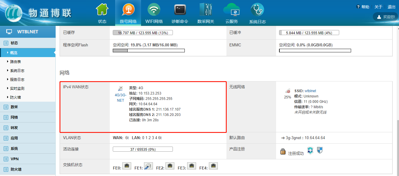 通常支持5G/4G/3G上網(wǎng)的網(wǎng)絡(luò)隔離器的出廠配置是5G/4G/3G流量卡上網(wǎng)的模式,使用上電前將流量卡、天線(5G/4G/3G天線延長線的SMA頭是針,網(wǎng)絡(luò)隔離器上的連接頭是孔)裝上就可以了。也可以進入網(wǎng)絡(luò)隔離器的WEB界面,查看5G/4G/3G信號值以及5G/4G/3G網(wǎng)絡(luò)聯(lián)網(wǎng)情況,如下圖: