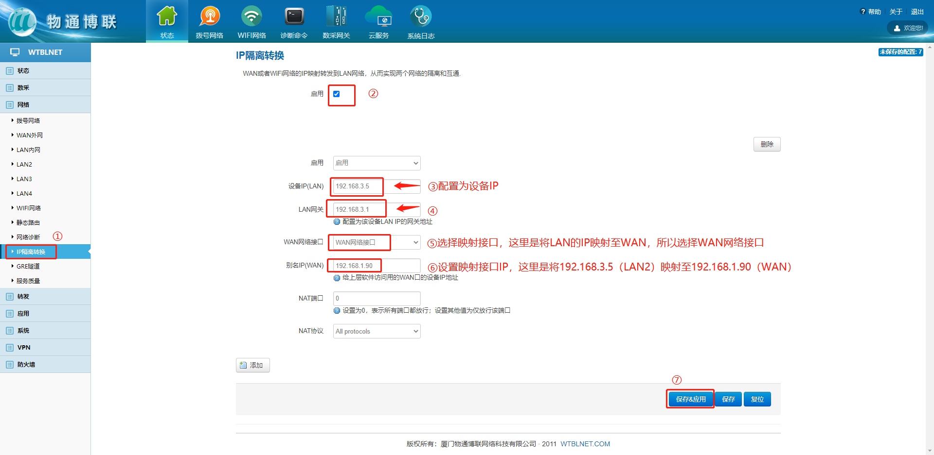 此處舉例PLC(IP:192.168.3.5)連接網(wǎng)關(guān)LAN口(IP:192.168.3.1),并將PLC的IP映射至網(wǎng)絡(luò)隔離器WAN口(IP:192.168.1.90),上位機(IP:192.168.1.8)即可通過隔離器WAN口訪問至位于隔離器LAN口的PLC。