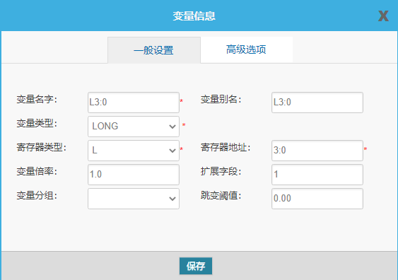 PLC采用網(wǎng)口通信時,變量配置主要填寫變量名(網(wǎng)口協(xié)議較為特殊,需配置成與PLC內(nèi)的變量名一致)、變量別名(自定義,建議使用中文),寄存器類型和寄存器地址無需配置(默認(rèn)即可),可定義一些數(shù)據(jù)規(guī)則(如:倍率、小數(shù)點、單位、報警規(guī)則等)。