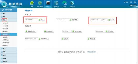 進(jìn)入網(wǎng)關(guān)WEB界面,在“網(wǎng)絡(luò)”- >“網(wǎng)絡(luò)診斷”界面中,通過(guò)Ping和Telnet可測(cè)試網(wǎng)關(guān)是否和松下PLC正常連接。