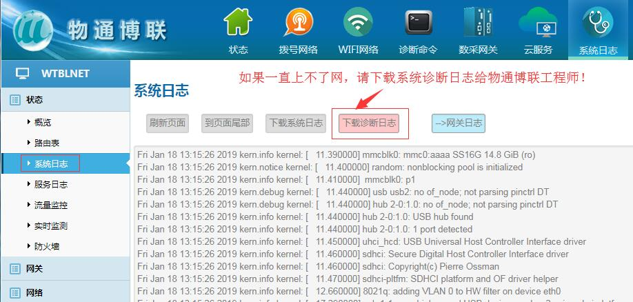 如果通過如上設(shè)置還是沒辦法上網(wǎng),請下載診斷日志,然后發(fā)給物通博聯(lián)工程師;我們工程師會根據(jù)系統(tǒng)日志診斷問題并提出指導(dǎo)建議。