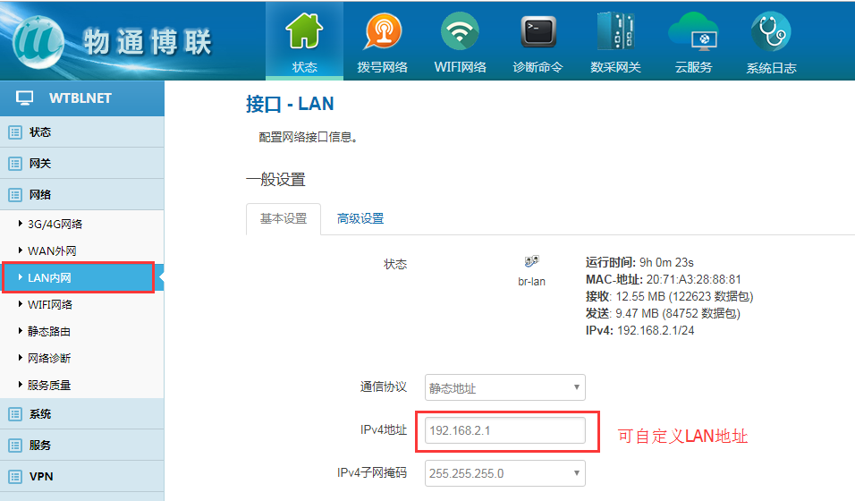 網(wǎng)關(guān)LAN以太網(wǎng)地址可自定義,但WAN以太網(wǎng)地址和LAN以太網(wǎng)地址不能同一個網(wǎng)段。