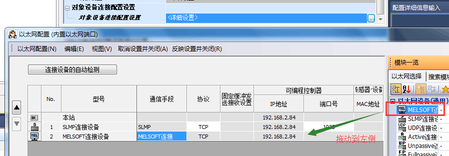 2、對象設(shè)備連接配置設(shè)置中新增“MELSOFT連接設(shè)備”通訊方式。