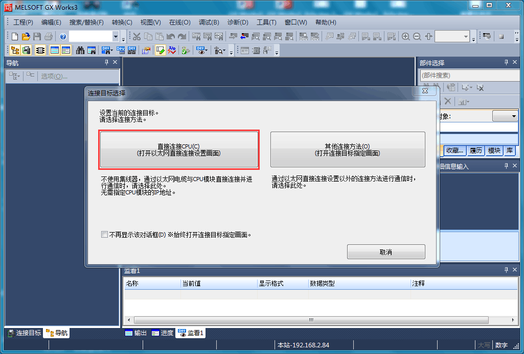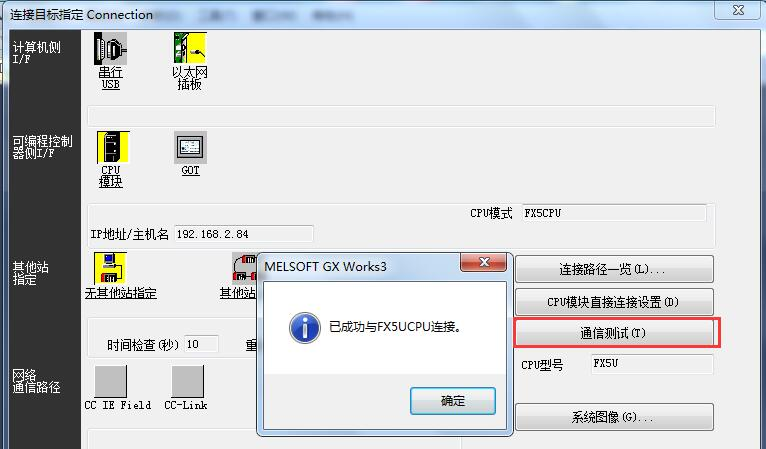 2、“CPU模式”設(shè)置,“經(jīng)由集線器連接”,填寫控制器的IP地址。