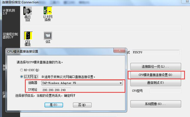 3、CPU模塊直連連接設(shè)置以太網(wǎng)適配適配器“TAP-WindowsAdapterV9”。