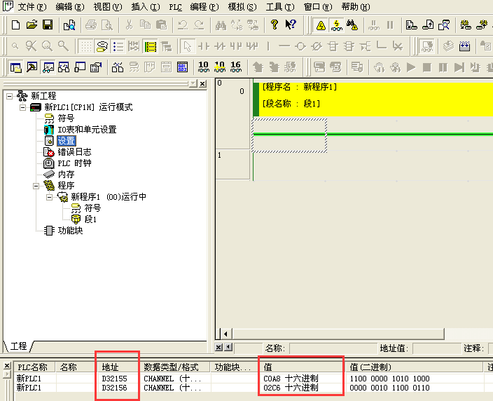 啟動CX-P,打開菜單欄中的PLC---自動在線---USB連接,連接成功后,打開菜單欄中的視圖---窗口---查看,輸入地址:D32155、D32156,將查詢得出的十六進(jìn)制的值換算成十進(jìn)制的值,就是CP1W-CIF41選件板的IP地址(C0A802C6=192.168.2.198)。