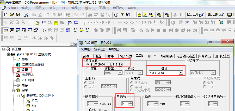 電腦與CH1P通過編程線直連后,啟動CX-P,打開菜單欄中的PLC---自動在線---USB連接,連接成功后,打開設(shè)置,設(shè)置串口參數(shù)(單元號、波特率、數(shù)據(jù)位、停止位、奇偶校驗、通信模式),如下圖所示: