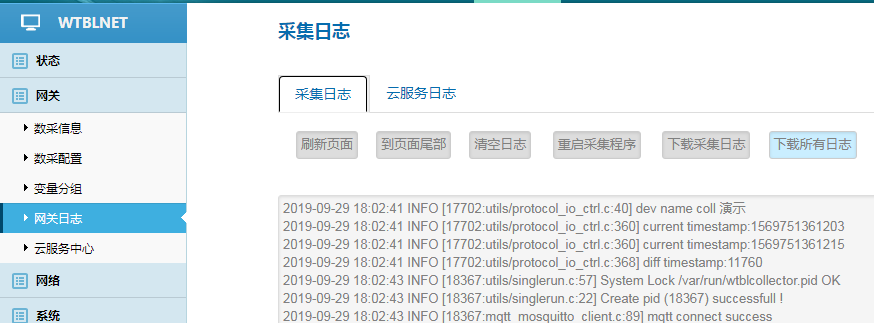 網(wǎng)關(guān)運行出現(xiàn)異常時,請將日志狀態(tài)調(diào)整為:調(diào)試。下載網(wǎng)關(guān)日志發(fā)送至物通博聯(lián)技術(shù)支持工程師處診斷。