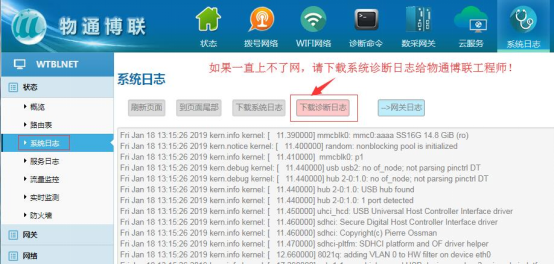 如果通過(guò)如上設(shè)置還是沒(méi)辦法上網(wǎng),請(qǐng)下載診斷日志,然后發(fā)給物通博聯(lián)工程師;我們工程師會(huì)根據(jù)系統(tǒng)日志診斷問(wèn)題并提出指導(dǎo)建議。