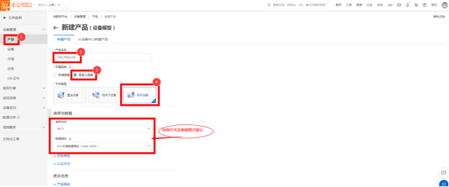 所屬品類根據(jù)實(shí)際場(chǎng)景選擇,節(jié)點(diǎn)類型選“直連設(shè)備”,連網(wǎng)方式,數(shù)據(jù)格式默認(rèn)。詳見圖2