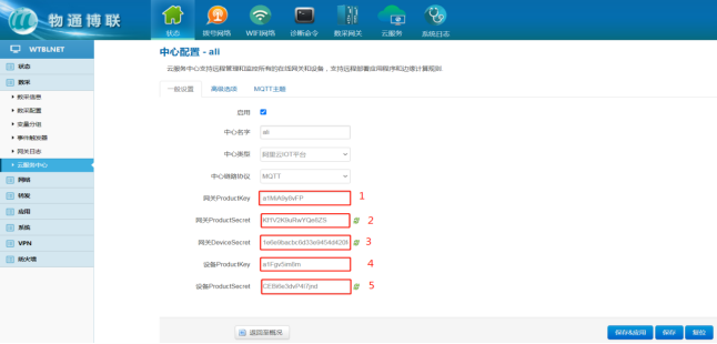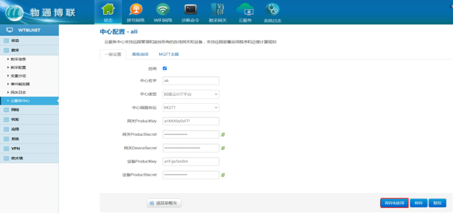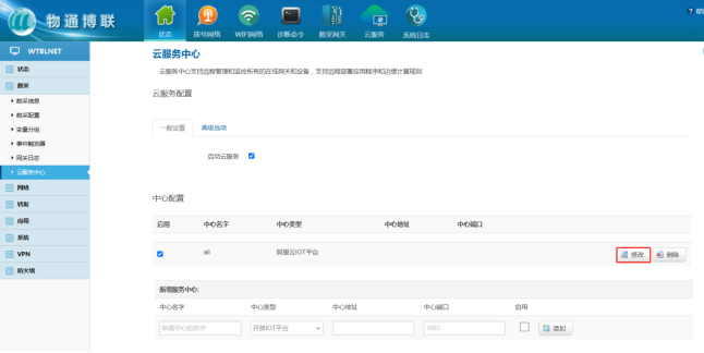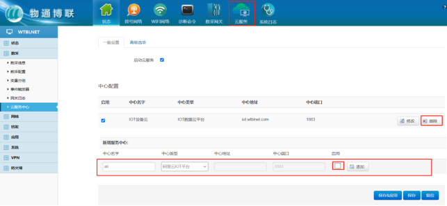 打開物通博聯(lián)網(wǎng)關(guān)WEB界面,可刪除原有的服務(wù)中心,新建一個(gè)連接中心,中心類型選擇阿里云IOT平臺(tái),啟用√ 點(diǎn)擊“添加” 保存應(yīng)用
