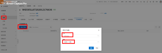 選擇剛添加產(chǎn)品網(wǎng)關(guān)的名稱,DeviceName請(qǐng)?zhí)顚懳锿ú┞?lián)對(duì)應(yīng)項(xiàng)目網(wǎng)關(guān)的網(wǎng)關(guān)系列號(hào),備注名稱可以設(shè)置成跟產(chǎn)品相關(guān)的名稱。詳見以下圖
