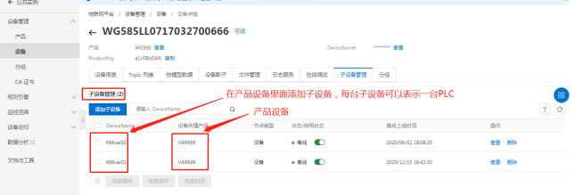 如果網(wǎng)關(guān)需要采集多臺(tái)的PLC設(shè)備在阿里云端可以在改產(chǎn)品設(shè)備中新增對(duì)應(yīng)臺(tái)數(shù)的子設(shè)備,1臺(tái)PLC設(shè)備對(duì)應(yīng)1個(gè)阿里云平臺(tái)的子設(shè)備。