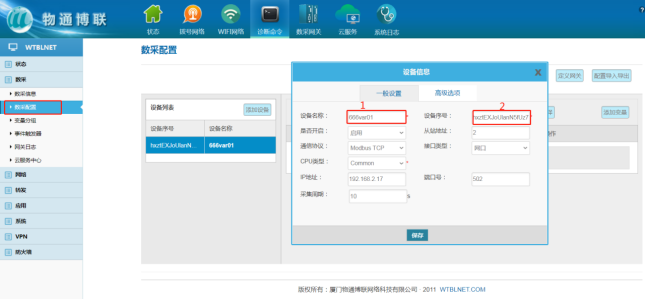 返回網(wǎng)關(guān)WEB界面,網(wǎng)關(guān)數(shù)采配置界面“添加設(shè)備”的數(shù)據(jù)參數(shù)。這邊模擬采集數(shù)據(jù)用modbus slave模擬工具進(jìn)行采集,也能用PLC進(jìn)行采集。