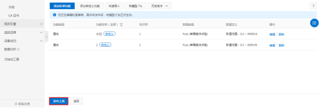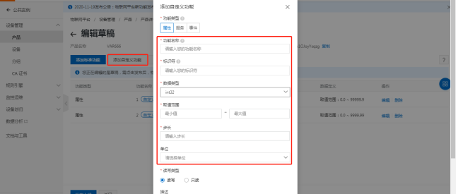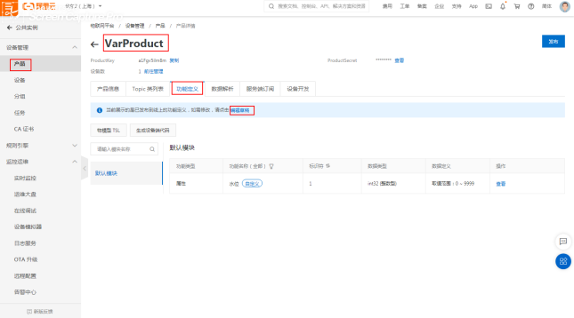 點(diǎn)擊產(chǎn)品—節(jié)點(diǎn)類型為(設(shè)備)—查看—功能定義—自定義功能。(阿里云變量上限只能添加256個(gè))