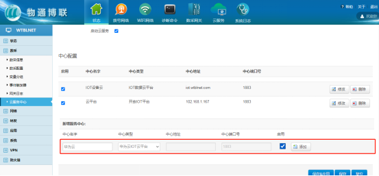 (4)第三方平臺設備接入:例如阿里云、華為云、百度云等第三方設備接入平臺,網(wǎng)關已開發(fā)好適配此類第三方平臺的物模型接入,例如華為云,填寫相關連接參數(shù),配置內容,即可將數(shù)據(jù)上傳至華為云IOT設備接入模型中(網(wǎng)關支持的第三方接入云,都有詳細的配置手冊)。