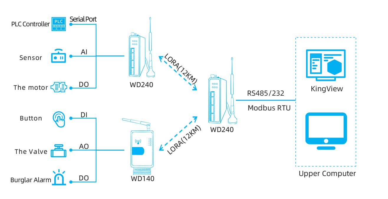WideIOT·WD IOT Terminals mainly realizes the acquisition and control of digital DI, DO, analog AI, and AO of on-site industrial equipment, and realizes the functions of LORA local networking and 4G data cloud, so as to realize Data acquisition and control of field sensors, actuators, indicator lights, etc.