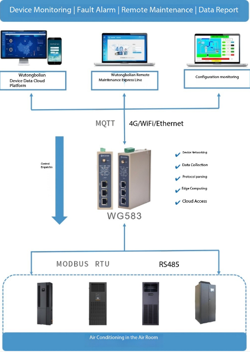 Additionally, faults are passively responded to, leading to significant risk (potential hazards). By integrating with the WideIOT Industrial Smart Gateway and Industrial IoT Cloud Platform, real-time collection of equipment parameters from air conditioning units can be achieved, enabling real-time monitoring of unit operational status, real-time alerts for warnings and faults, and displaying current energy consumption to facilitate energy-saving optimizations.