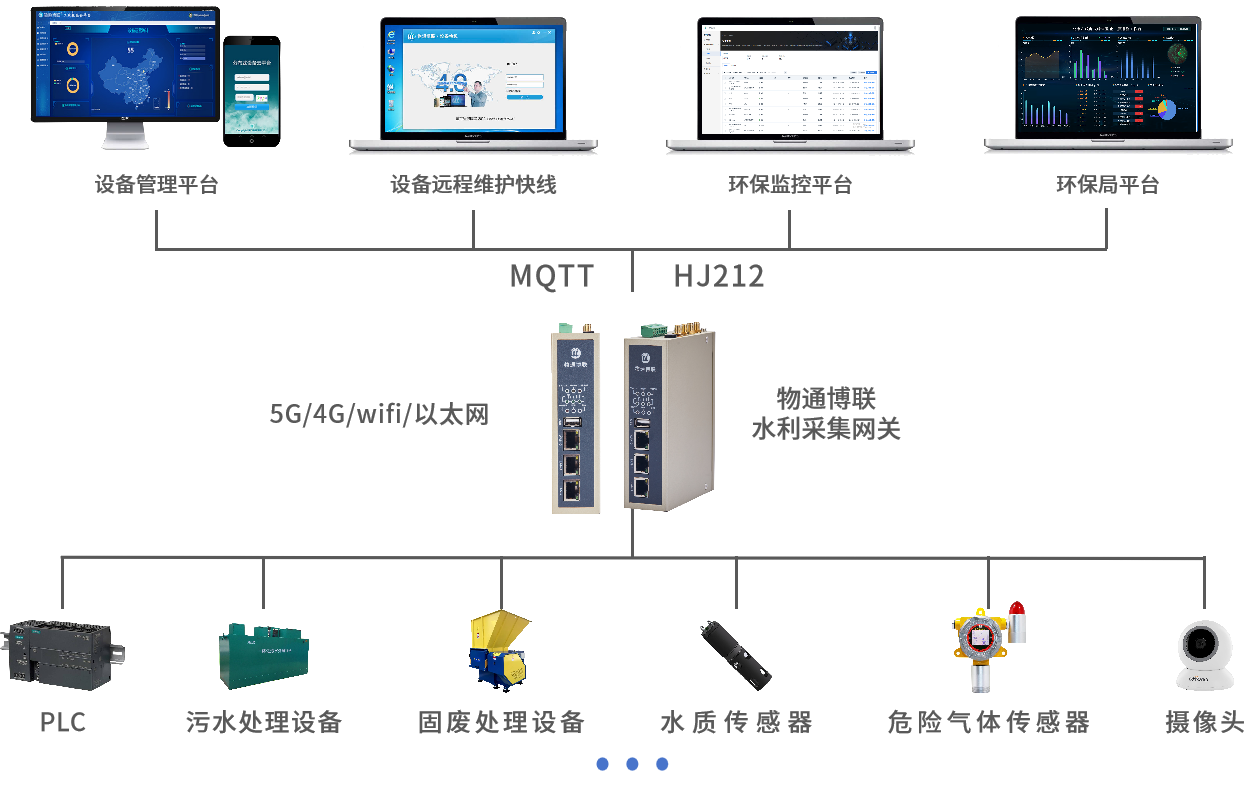 物通博聯(lián)環(huán)保采集網(wǎng)關(guān)可以連接各種環(huán)保設(shè)備、傳感器、儀表、IO數(shù)據(jù)和PLC,通過(guò)MQTT協(xié)議上傳到設(shè)備管理平臺(tái)和通過(guò)HJ212協(xié)議上傳到環(huán)保局監(jiān)控平臺(tái),實(shí)現(xiàn)設(shè)備遠(yuǎn)程監(jiān)控和數(shù)據(jù)分析,為環(huán)境監(jiān)測(cè)和管理提供重要的決策支持。