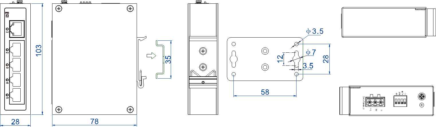 | 機(jī)械結(jié)構(gòu) | 外殼:IP40防護(hù)等級(jí),金屬外殼 安裝:DIN導(dǎo)軌式或壁掛式安裝 尺寸(寬×高×深):28mm×103mm×78mm |