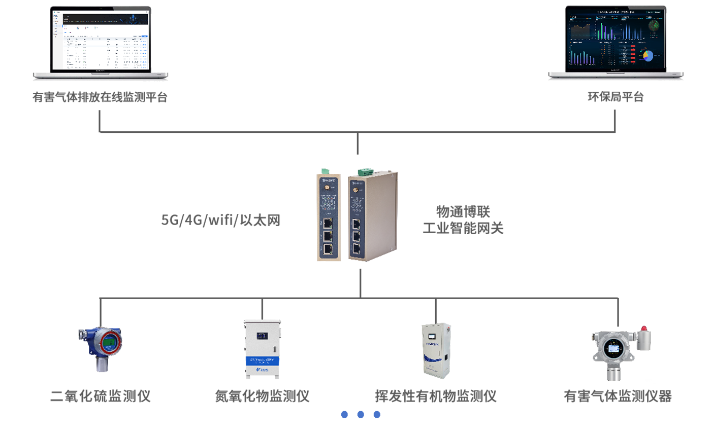 在可能產生有害氣體排放的區(qū)域安裝各類有害氣體監(jiān)測儀器(如二氧化硫監(jiān)測儀、氮氧化物監(jiān)測儀、揮發(fā)性有機物監(jiān)測儀等),通過物通博聯的工業(yè)智能網關將采集到的有害氣體濃度數據實時傳輸至有害氣體排放在線監(jiān)測平臺。平臺對數據進行實時分析和存儲,當有害氣體濃度超標時立即發(fā)出預警,并將相關信息發(fā)送給環(huán)保監(jiān)管部門和企業(yè)管理人員。同時,平臺具備數據統(tǒng)計分析功能,可對排放趨勢進行分析、對區(qū)域污染情況進行評估,支持遠程監(jiān)管控制和數據共享發(fā)布。