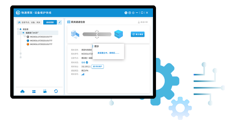 使用物通博聯(lián)的設(shè)備維護(hù)快線(xiàn),通過(guò)賬號(hào)登錄后,找到相應(yīng)網(wǎng)關(guān)建立維護(hù)通道,就可以搭建通往設(shè)備現(xiàn)場(chǎng)的網(wǎng)口通道和串口通道,讓工程師不用遠(yuǎn)程出差就可以像到現(xiàn)場(chǎng)一樣,實(shí)現(xiàn)隨時(shí)隨地遠(yuǎn)程維護(hù)。