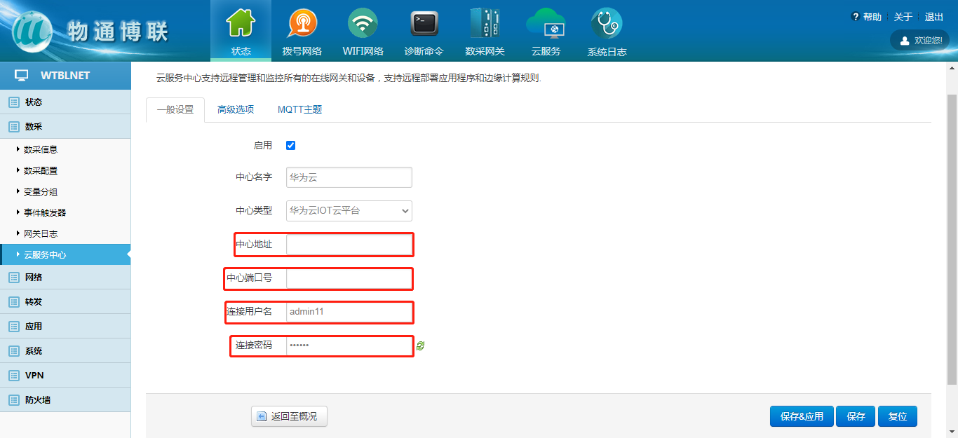 工業(yè)網(wǎng)關(guān)配置界面,填寫相關(guān)連接參數(shù),配置內(nèi)容,即可將數(shù)據(jù)上傳至華為云IOT設(shè)備接入模型中(每種不同的第三方接入云,都有詳細(xì)的配置手冊(cè))