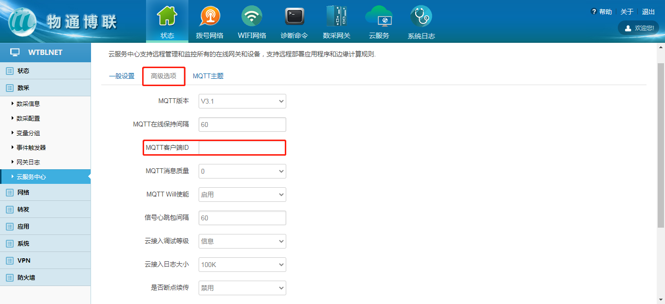 在高級(jí)選項(xiàng)中配置MQTT客戶端ID連接參數(shù),填寫完畢后保存并應(yīng)用;