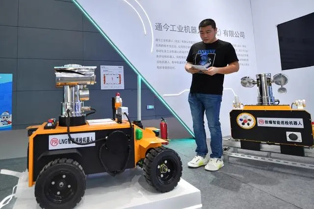 9月7日,參觀者在本屆數(shù)博會(huì)上參觀LNG智能巡檢機(jī)器人。新華社記者 駱學(xué)峰 攝