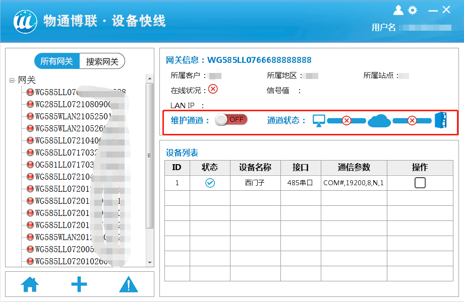 登錄設(shè)備快線,選擇一臺(tái)需要維護(hù)的在線網(wǎng)關(guān),點(diǎn)擊建立通道。等到通道狀態(tài)都是綠色打鉤后就證明通道建立完成,以太網(wǎng)設(shè)備可以通過(guò)ping來(lái)測(cè)試通道情況。