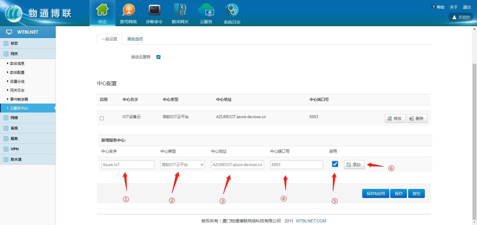 3、打開(kāi)物通博聯(lián)網(wǎng)關(guān)WEB界面,新建一個(gè)連接中心,中心類型選擇微軟IoT云平臺(tái),輸入相應(yīng)信息,勾選啟用,點(diǎn)擊“添加” ,填寫(xiě)對(duì)應(yīng)數(shù)據(jù)即可實(shí)現(xiàn)設(shè)備數(shù)據(jù)上傳到微軟Azure IoT物聯(lián)網(wǎng)平臺(tái)。