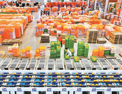 12月16日,在江西省贛州市安遠縣產(chǎn)城新區(qū)的一家采用5G+工業(yè)互聯(lián)網(wǎng)技術的果業(yè)加工企業(yè)內(nèi),工人在智能化生產(chǎn)線上加工包裝贛南臍橙。朱海鵬攝(人民視覺)