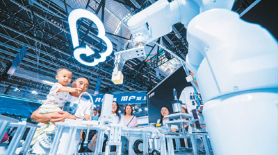 9月6日,2023中國國際數(shù)字經(jīng)濟博覽會在河北省石家莊市開幕,圖為小朋友在博覽會上參觀工業(yè)機器人。朱海鵬攝(人民視覺)