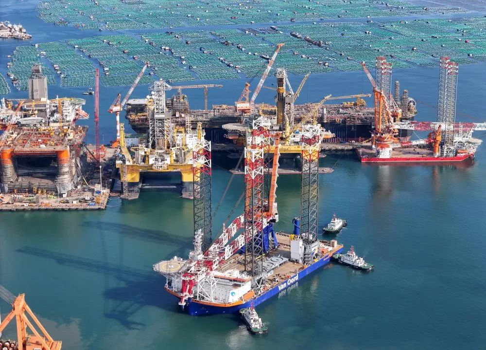 在中集來(lái)福士山東煙臺(tái)建造基地,多型海工裝備和特種船舶在進(jìn)行建造和測(cè)試(10月16日攝,無(wú)人機(jī)照片)。新華社發(fā)(唐克攝)