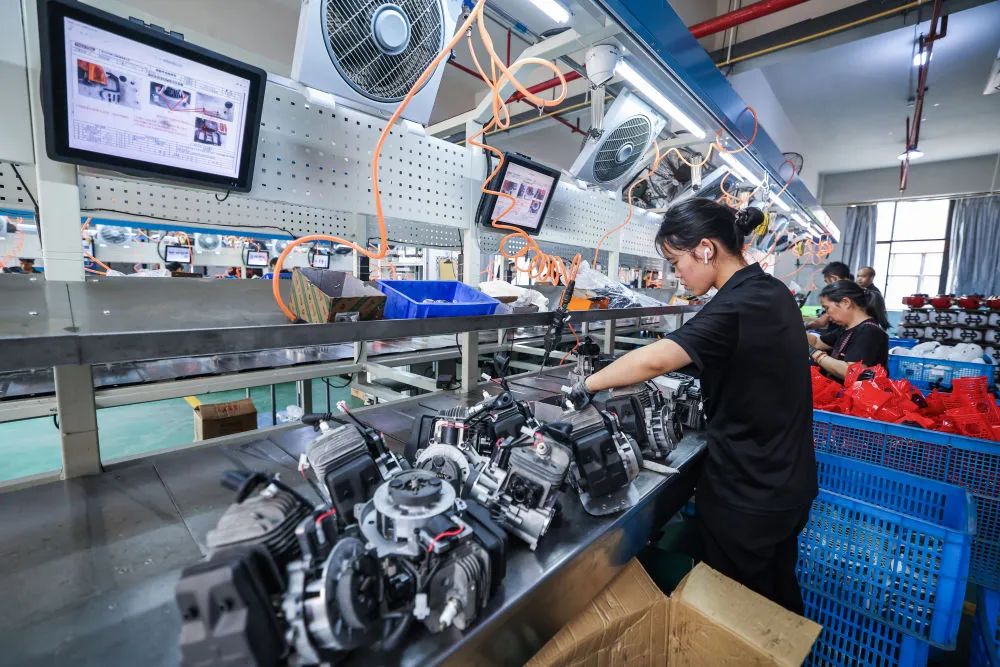 2024年8月14日,在位于金華市的浙江托馬斯工具制造有限公司數(shù)字化車間內(nèi),工人在流水線上生產(chǎn)出口的園林機(jī)械。新華社記者 徐昱 攝