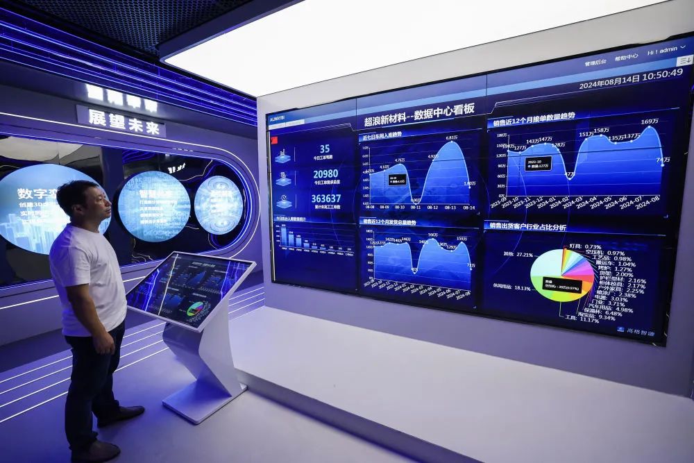 8月14日,在金華市金東區(qū)江東鎮(zhèn)的浙江超浪新材料有限公司內(nèi),數(shù)據(jù)中心看板實(shí)時(shí)顯示企業(yè)流水線的各項(xiàng)生產(chǎn)數(shù)據(jù)。新華社記者 徐昱 攝