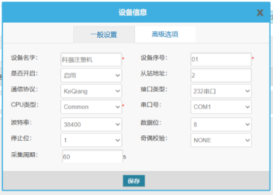 輸入設備名稱(任意),設備序號(任意,注意同一網關下的設備序號不能重復),從站地址(設備站號),通信協(xié)議(KeQiang,根據注塑機型號選擇),接口類型(232串口),串口號(連接網關端串口號),以及串口參數(一般注塑機默認波特率是38400,數據位8,無校驗,停止位1),采集周期根據自身需求設置,然后點擊保存。