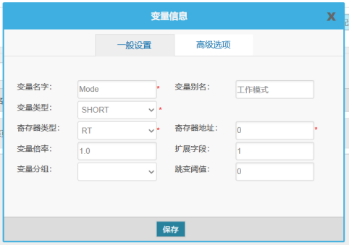 填寫點位相關信息,變量名(任意),變量別名(任意),變量類型(根據點位數據類型選擇,具體可查看網關支持的數據類型),寄存器類型(固定選擇RT)以及寄存器地址(按照注塑機點位表填寫,例如工作模式對應寄存器地址0),然后點擊保存。