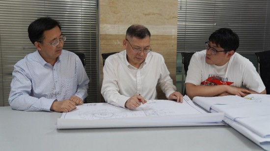 龔存忠(中)與團(tuán)隊(duì)研討技術(shù)方案。中國船舶集團(tuán)第七〇四研究所供圖