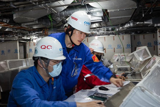 馬玲(中)在“愛達(dá)·魔都號”集控室對自動化系統(tǒng)調(diào)試狀態(tài)進(jìn)行確認(rèn)。外高橋造船供圖