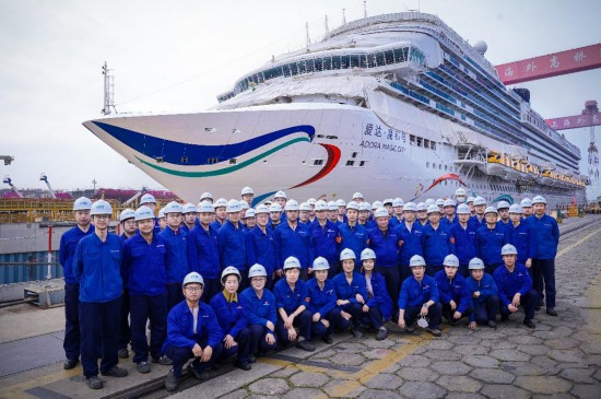 “愛達(dá)·魔都號”試航歸來,郵輪項(xiàng)目部人員合影。外高橋造船供圖