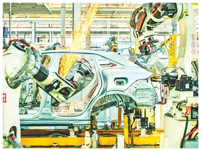 江蘇南京一家汽車自動(dòng)化生產(chǎn)車間內(nèi),機(jī)械臂靈活焊接新能源汽車。朱紅生攝