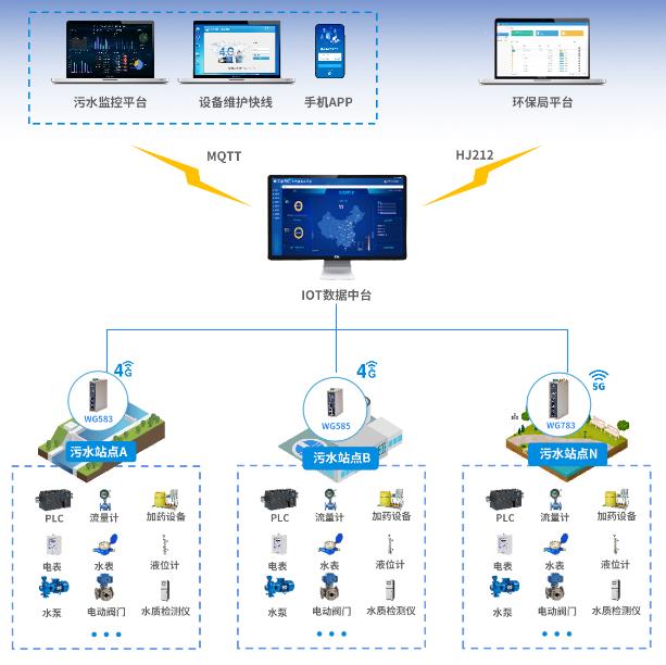 基于日常巡檢與遠程維護的需求,物通博聯(lián)提供基于工業(yè)智能網(wǎng)關的解決方案。通過將污水處理PLC、DLT智能電表、智能攝像頭等設備接入到網(wǎng)關,網(wǎng)關能夠?qū)崟r采集污水處理工藝參數(shù)、能耗以及實時視頻等數(shù)據(jù),并通過4G網(wǎng)絡和MQTT協(xié)議對接到集團運維管理平臺中,從而實現(xiàn)遠程監(jiān)控、遠程控制、遠程抓拍、遠程維護等功能,從而實現(xiàn)智慧運維管理,促進降本增效目標的實現(xiàn)。