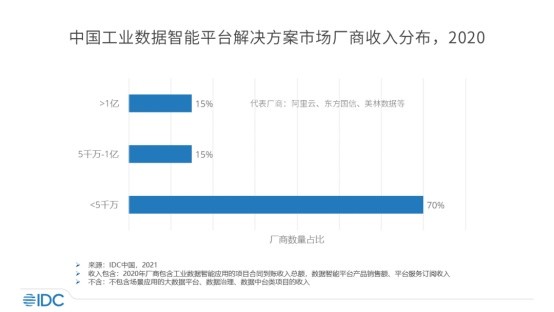 目前廠商布局大多集中在業(yè)務(wù)流程相似度高、付費能力強、數(shù)據(jù)基礎(chǔ)好、工藝復(fù)雜的能源電力、石油石化、裝備制造、鋼鐵、半導(dǎo)體等少數(shù)行業(yè),多數(shù)廠商選擇重點布局2-3個行業(yè)或場景。由于項目難度大,周期長,多數(shù)廠商年收入在5千萬以下,市場格局未來變數(shù)較大。重點子市場——平臺解決方案市場,2020年,市場總規(guī)模15.98億元人民幣,同比增長42.9%。